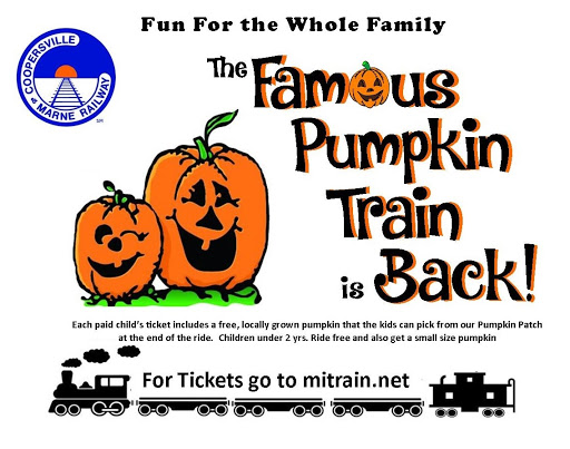 The Famous Pumpkin Train Speaking of pumpkins, you definitely don't want to miss this Fall tradition. The Famous Pumpkin Train in Coopersville will take you on a fun-filled ride of characters like the Grand Pumpkin and Scarecrow, Fall colors and a pumpkin patch to pick from at the end. For a full list of dates the train runs and ticket pricing, click here - 50% Capacity Train Rides: October 11, 11am and 1:30pm, October 24, 1:30pm and 3:30pm.