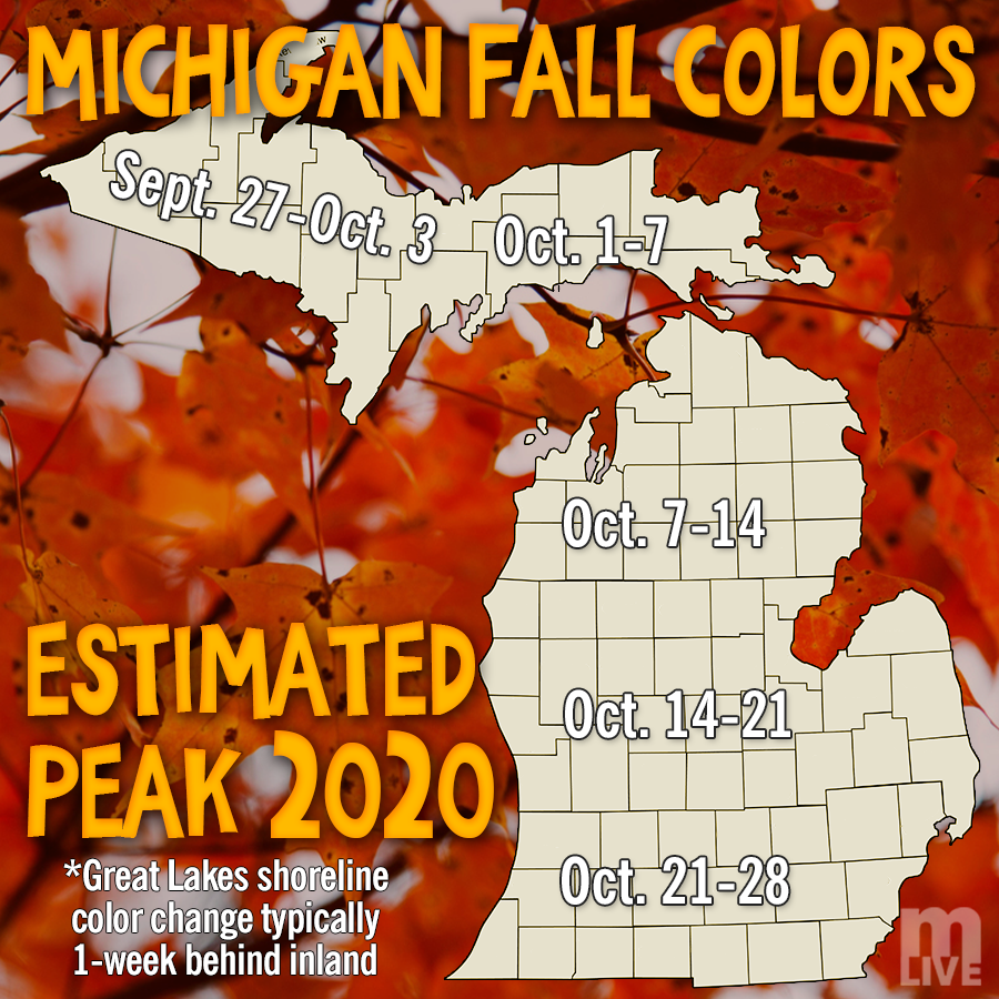 Grand Haven Area Fall ColorsIf you travel inland of Grand Haven you can experience beautiful colors from now until October 26; however, if you want to see pretty colors closer to the lake shore there is a lag time of about week. For example, current prediction peak colors for the Grand Haven Area is Oct. 14-21; which would make peak colors along the lake shore Oct. 21-28.