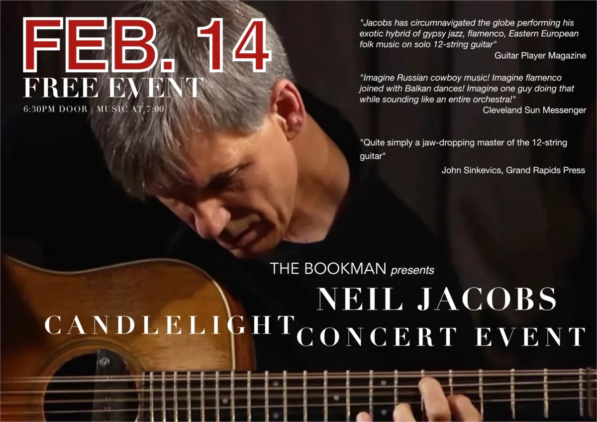 Neil Jacobs is truly a masterful performer on the 12-string acoustic guitar. With his own captivating style of playing that the St. Louis Riverfront Times describes as "mesmerizing" and the Austin Chronicle describes as "the rockin'est since early Leo Kottke". Neil covers the world vibe with music as diverse as Gypsy, World, Balkan Folk, Jazz, Classical, and Modern Fingerstyle, while transforming his 12-string acoustic guitar into his own personal orchestra. Neil draws inspiration from his world travels and experiences, and shares his fascinating stories with his audience.