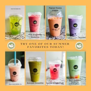 White Peach Pineapple, Earl Grey Vanilla, Black Coconut, Fruit Medley, Taro, Coffee Vanilla, White Peach Lychee, Traditional, Black Strawberry, Green Honeydew, Thai, Coffee Carmel, Watermelon, Matcha Coconut, Chai Vanilla, Chocolate, White Peach Guava, Coffee Coconut, Red Bean Coconut, White Peach Mango, Black Brown Sugar, Hazelnut, Avocado, Coffee Hazelnut, Black Strawberry & Raspberry, Lavender Lemon Cookie, Dragon Fruit with Vanilla, Peach & Cream