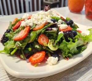 Kirby also knows how to serve up some good food. Alongside the cocktails, the chef made us their popular Spiced Mahi Tacos and Summer Berry Salad. The tacos are served on fresh tortillas and are filled with lettuce, pickled red onions, pico de gallo, guacamole, queso fresca, lime-cilantro crema, and of course, a perfectly seasoned piece of Mahi-Mahi. If you’re looking for something a little lighter that has just as much flavor, their Summer Berry Salad is a pile of hearty artisan mixed greens topped with goat cheese, fresh berries, and a blueberry vinaigrette.