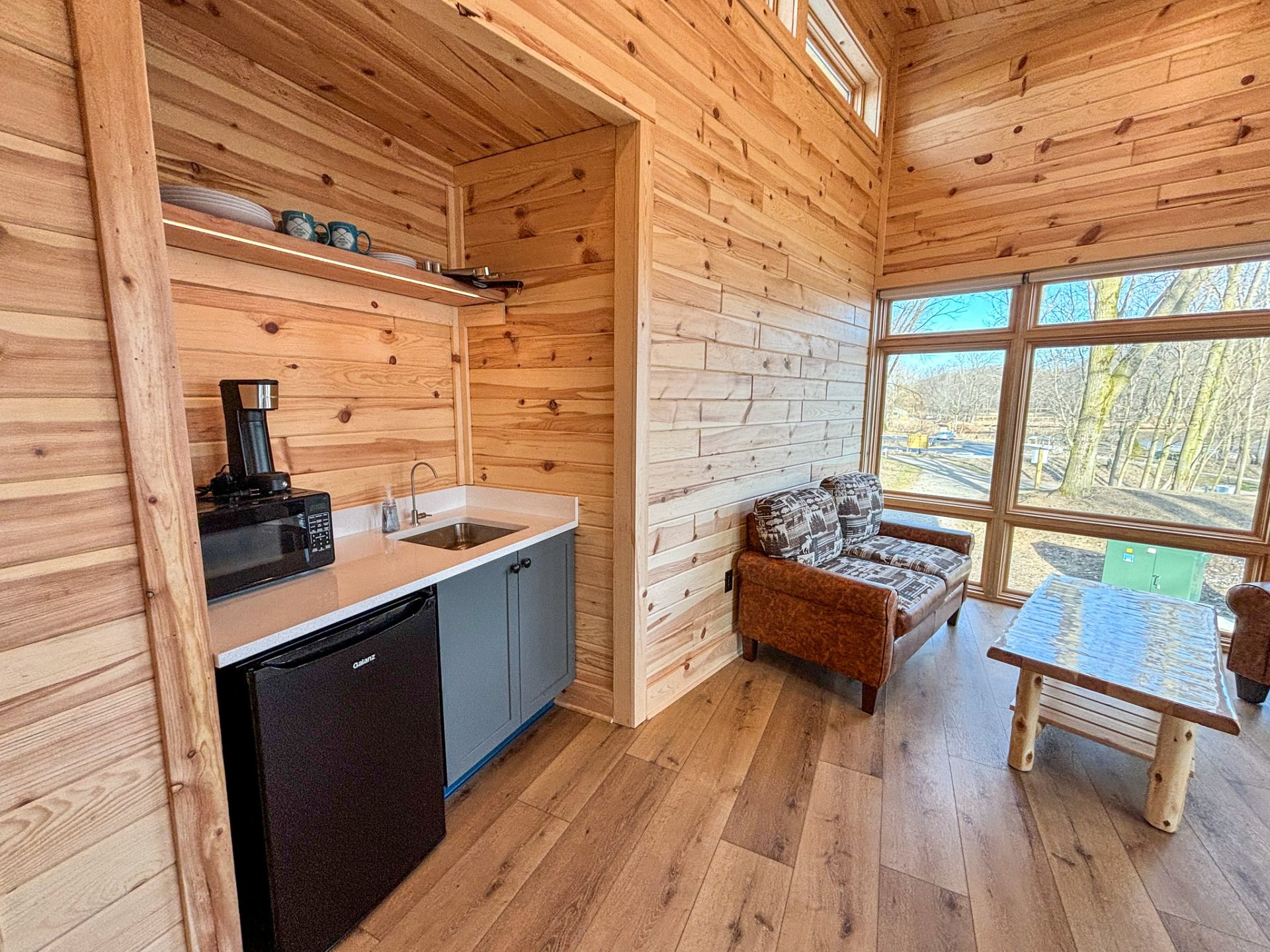- Kitchenette with microwave, small fridge, and single-cup coffee maker