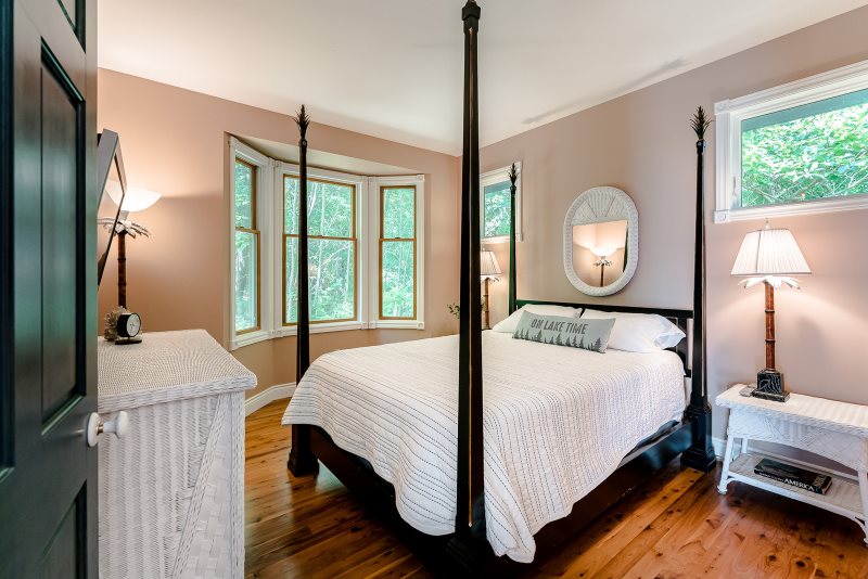 The house features 5 bedrooms and 3 full bathrooms. The bedroom on the main level has a queen bed. The second level has 3 bedrooms and 1 full bathroom. Bedroom 2 is the Master Bedroom with a king bed and private balcony. Bedroom 3 has a queen bed, and bedroom 4 has a queen bed and a crib. Bedroom #5 is on the third level of the house with a twin trundle bed. The lower level has 2 murphy beds, twin bunk beds, and another full bathroom.