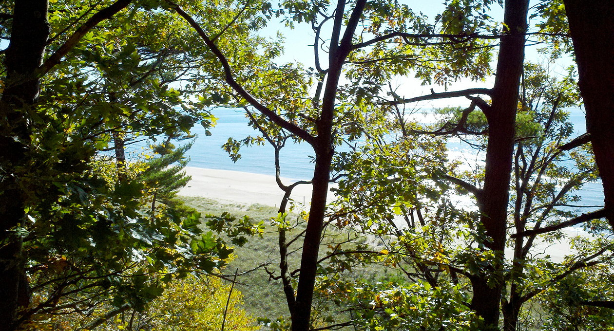 This mostly wooded 20-acre site includes a mature beech-maple-hemlock forest, a steep dune formation, and 738’ of Lake Michigan frontage. Improvements completed in 2012 include a paved parking area, modern restrooms, a barrier-free trail loop, and an extensive series of stairs and boardwalks traversing the dune and providing access to the sandy beach. Decks provide seating and views of Lake Michigan and host a display highlighting the property as the site of a scene from the Tom Hanks movie, “Road to Perdition.” Motor vehicle parking fees are in effect from Memorial Day weekend through Labor Day weekend.