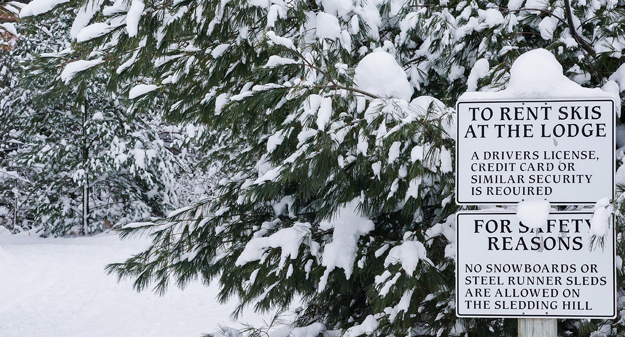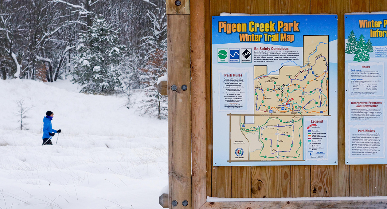 Pigeon Creek Park is 282 acres with another 130 adjacent acres of County Open Space land. Over ten miles of ski trails and snowshoe trails wind through old pine plantations, mature deciduous forests, and bottomland forests along the Pigeon River. The park is a popular cross-country ski destination with groomed trails for both classic and ski skating. Ski trails are groomed, tracked, and reset as needed throughout the day. A sledding hill is also provided. Three miles of ski trails and the sledding hill are illuminated for evening use. The Pigeon Creek Lodge provides ski rental, a food and beverage concession, and serves as a warming house. Hiking, dogs, biking, snowshoeing, and horseback riding are not allowed on groomed cross-country ski trails.