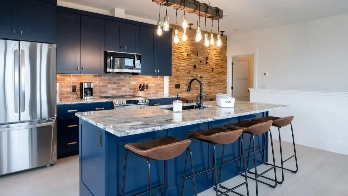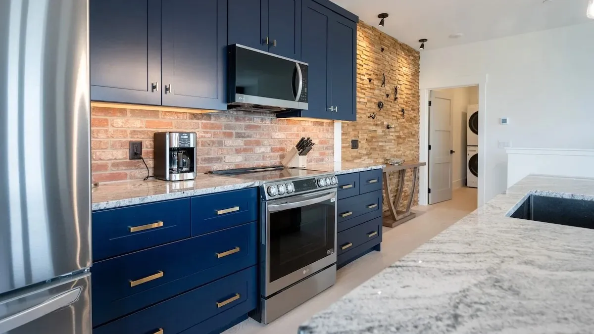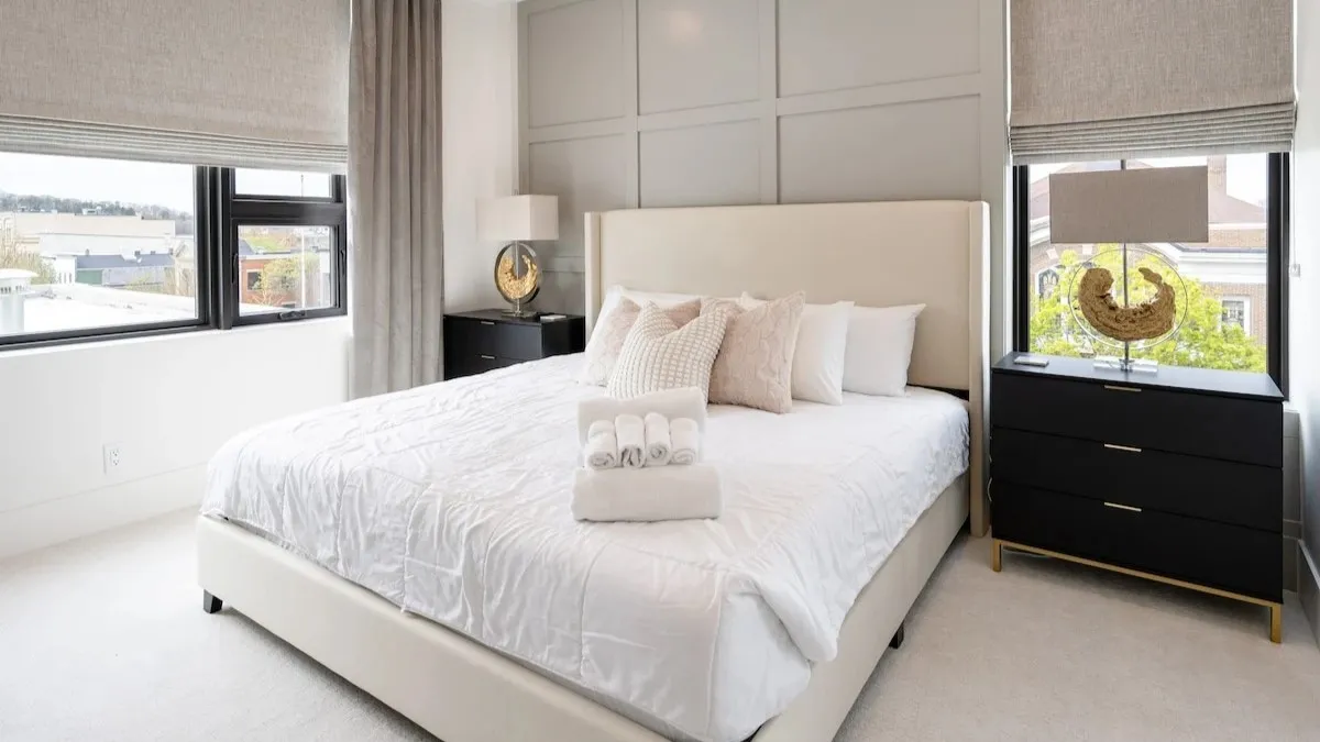 The primary bedroom is designed for comfort with a king bed and ensuite bath with custom tile and a walk-in shower. The lower-level bedroom provides sleep options with a twin daybed and trundle and a separate queen bed. This room has access to an additional full bath with a tub/shower.