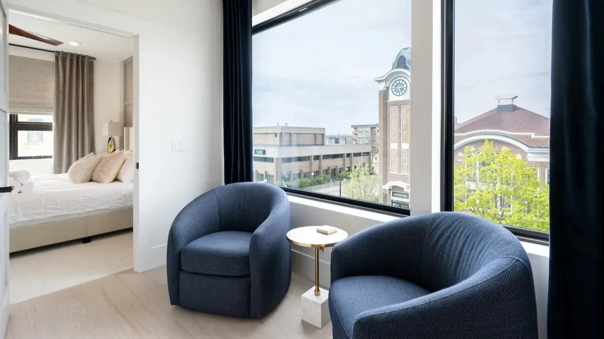 A private nook on the landing between floors is the perfect vantage point to enjoy the view from the floor-to-ceiling windows. An additional half bath and laundry area round out the amenities.