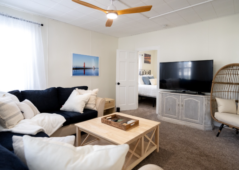 Camp Jackson: This cozy retreat is just a short walk from Downtown Grand Haven, offering a spacious main floor with a living/dining area, a galley kitchen, and a queen bedroom. Additional sleeping spaces and a TV area are located on the mid and top levels, while the home also features a full bath and laundry area. Relax outside on the screened-in porch or in the backyard with a fire pit and gas grill after a day of exploring.
