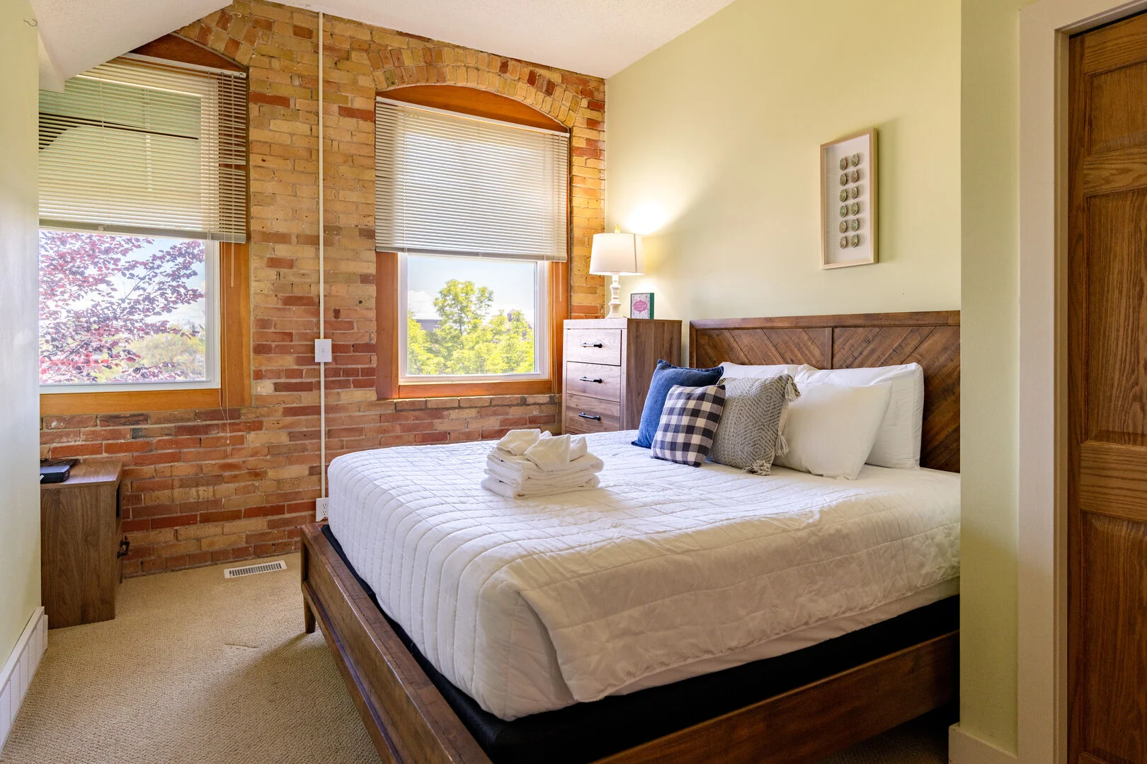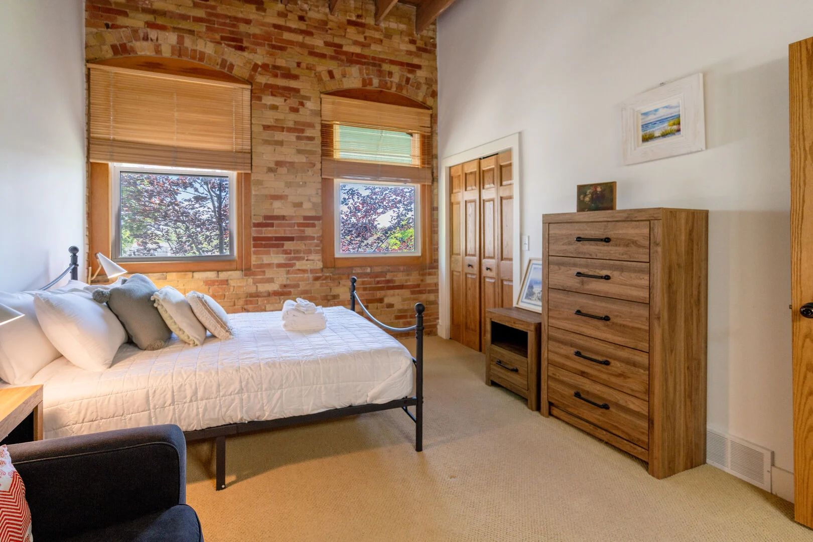 This historic downtown Grand Haven condo features an open living room, spacious kitchen, 2 bedrooms each with attached baths, a 4th-floor loft room with two twin beds, and 2nd story balcony.