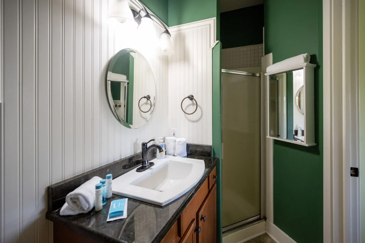 The third floor features a bedroom with a full bath attached. This bedroom has a Queen bed and a pull-out sofa sleeper with a twin bed. The second bedroom has a King bed with an adjoining full bathroom.