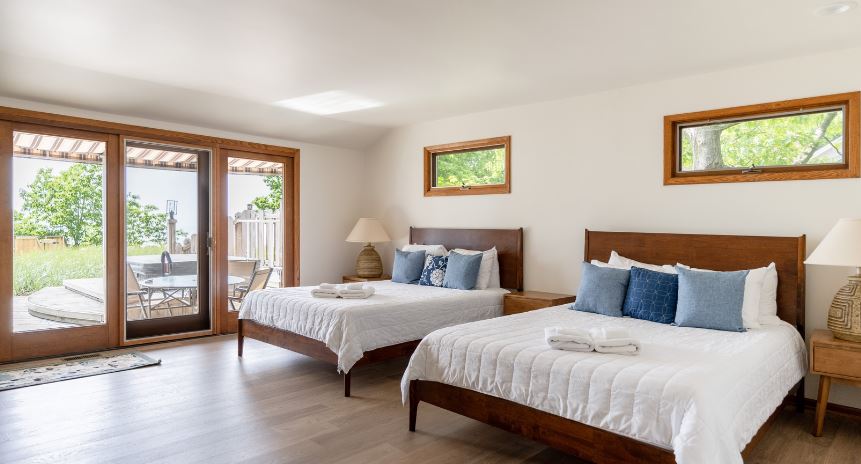 The Cottage at Holland Shores: This updated Lake Michigan cottage offers breathtaking views, a private beach, and accommodations for up to eight guests. It features three bedrooms, including a main floor primary with two queens and two upper-level bedrooms with queen beds. With three bathrooms, an open-concept living and dining area, a kitchen, and a lower-level family room there’s ample space for relaxation. Enjoy the hot tub or unwind on multi-level decks with panoramic lake views. The sandy beach is just steps away, perfect for sun-filled days and cherished summer memories. Reserve your stay for a slice of paradise!
