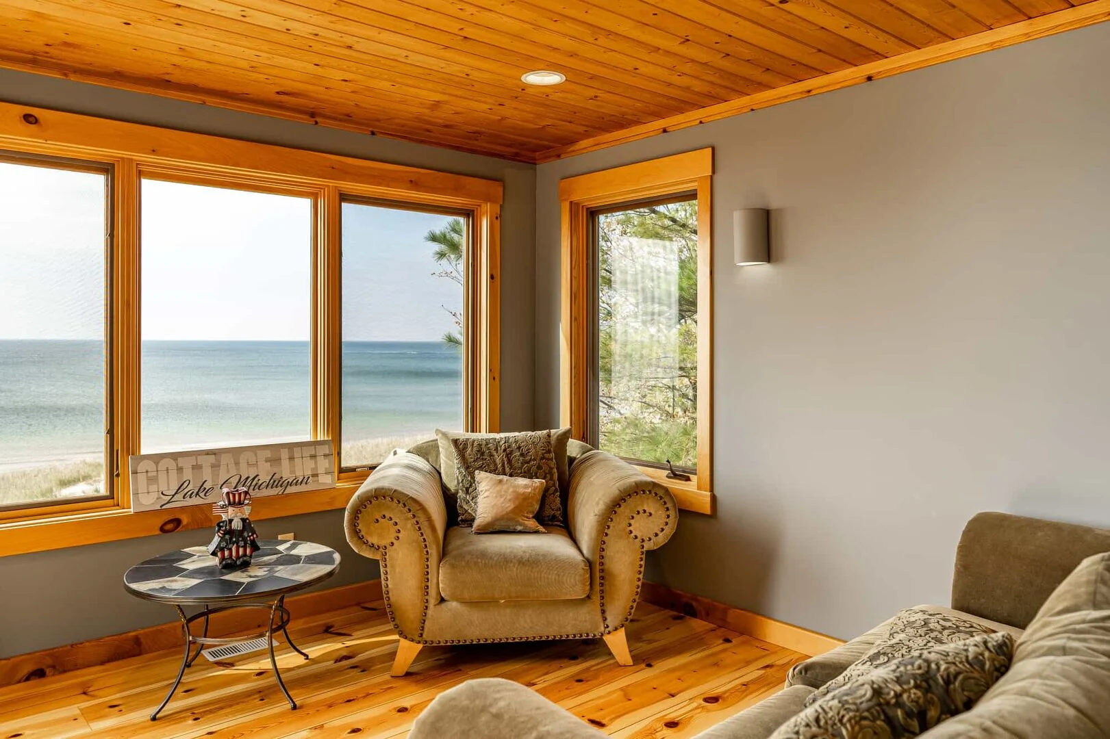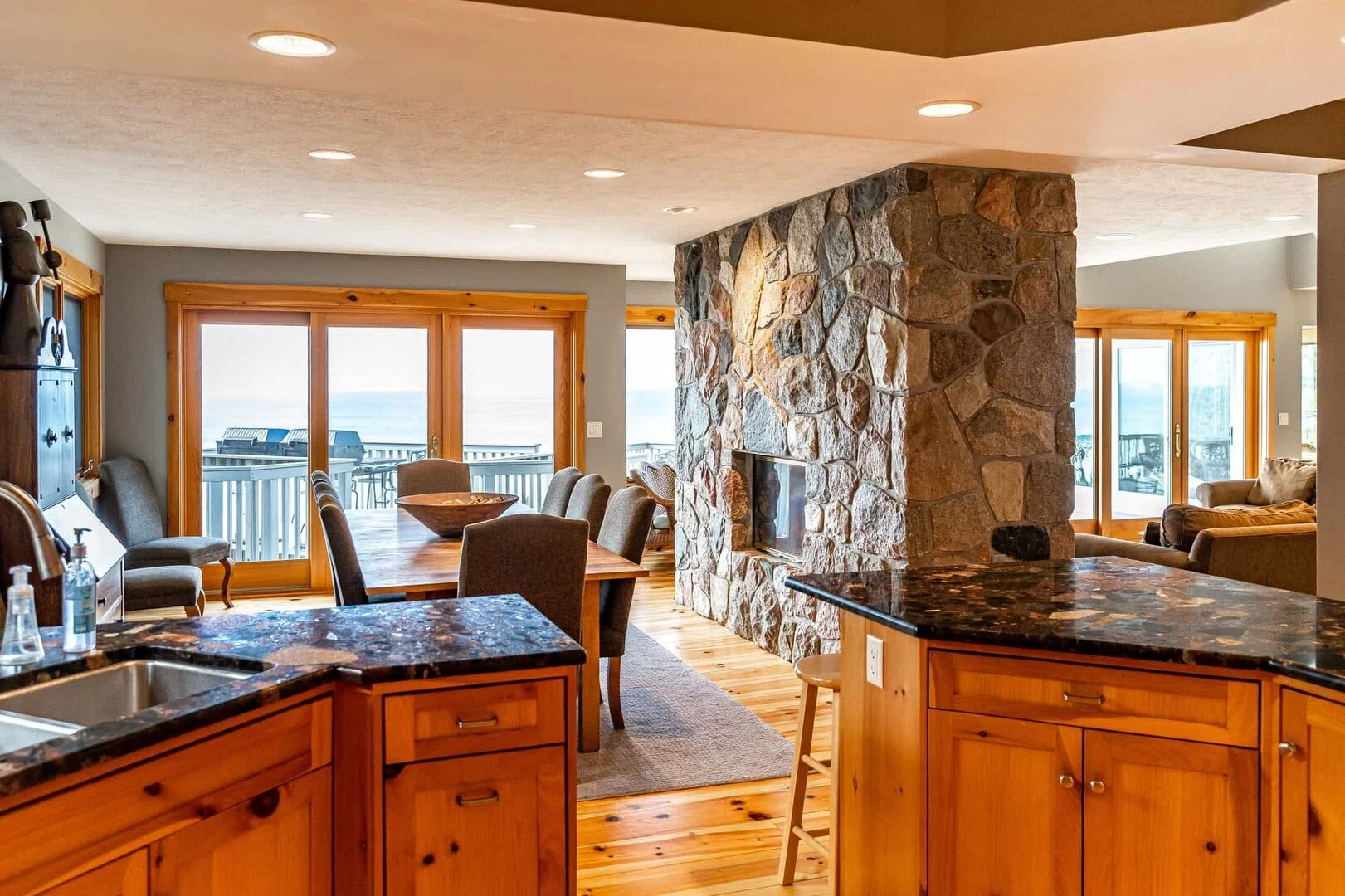 This cottage features 7 bedrooms and 5.5 baths with plenty of open spaces to gather together. The kitchen allows plenty of space to socialize, cook and enjoy the views of the lake. It even has a double-sided fireplace that warms the living room as well! The living room is designed to accommodate your whole group. The outdoor patio offers 2 grills with plenty of space for dining