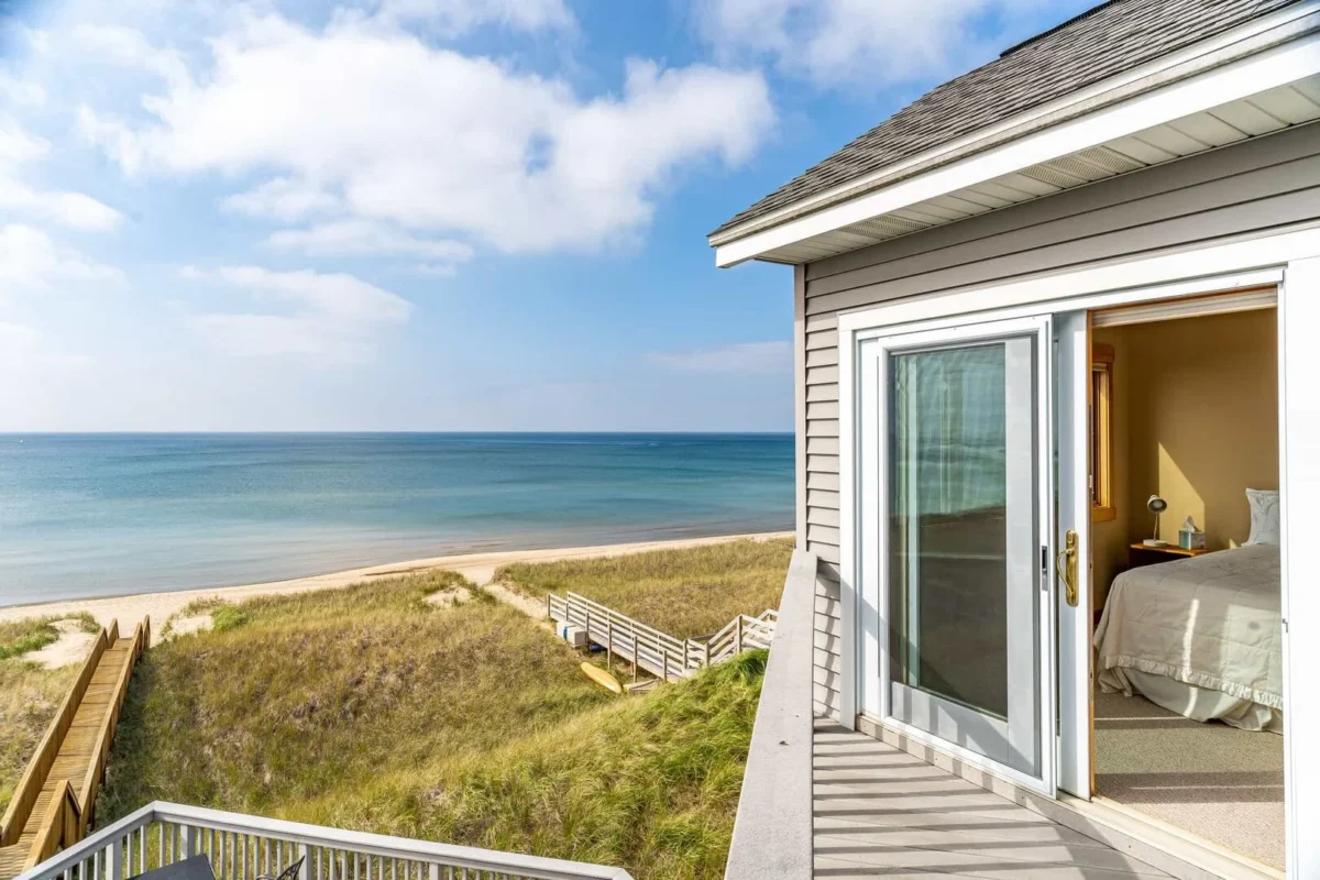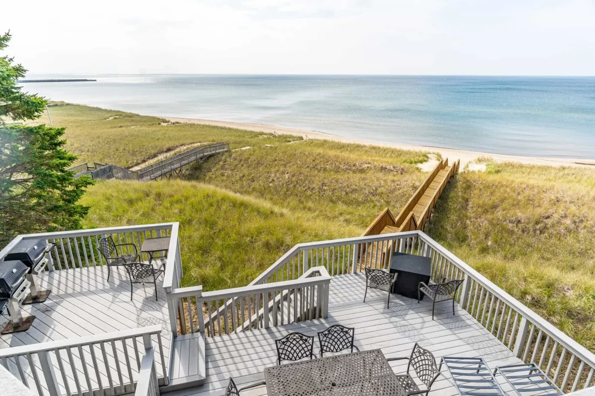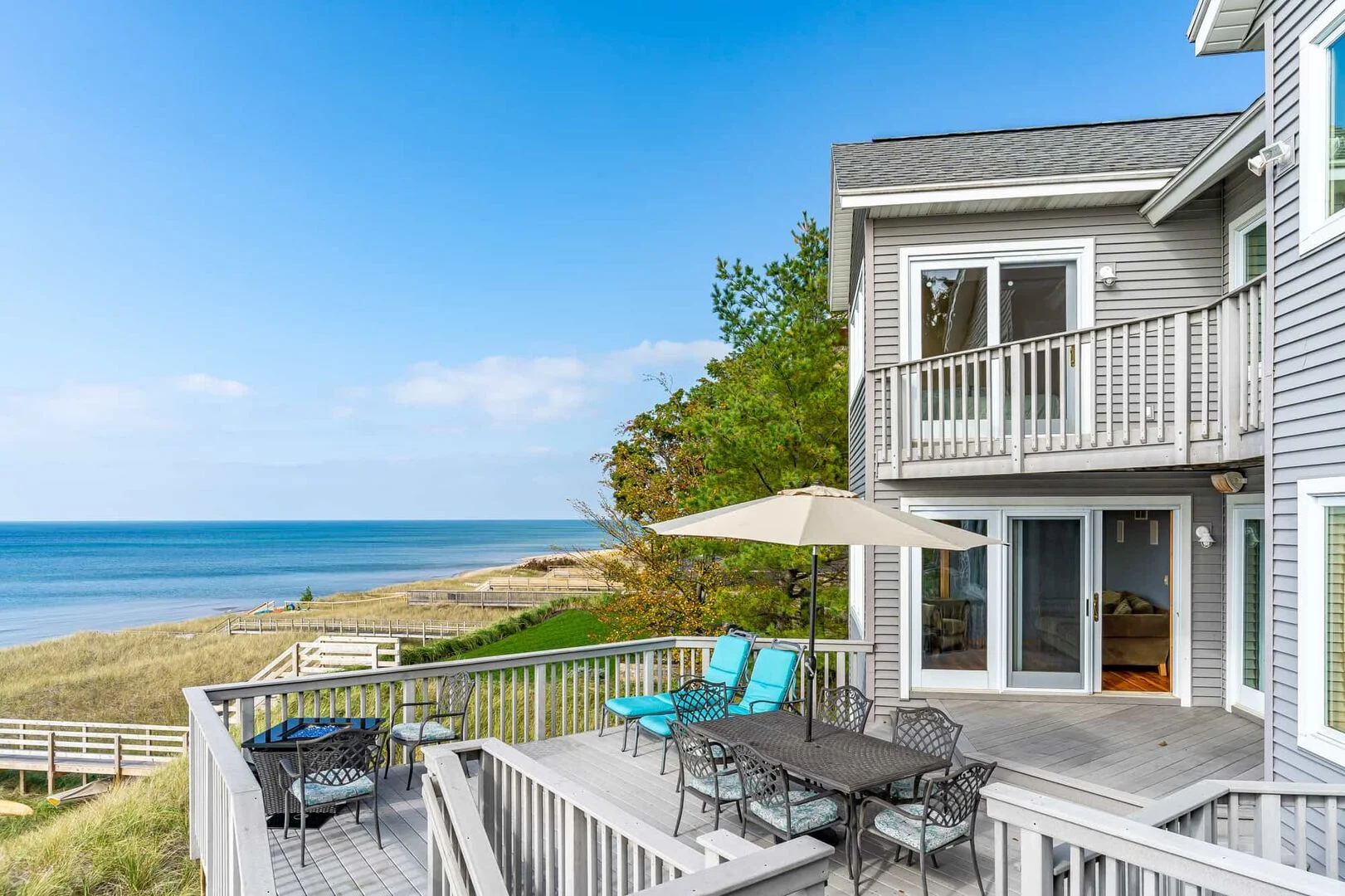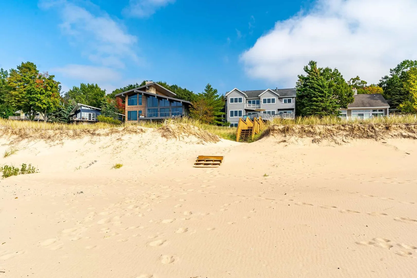 Spectacular views of Lake Michigan can be found throughout this spacious home and can be enjoyed from inside and out. Private walkway leads to sandy beach on the lakefront shoreline.