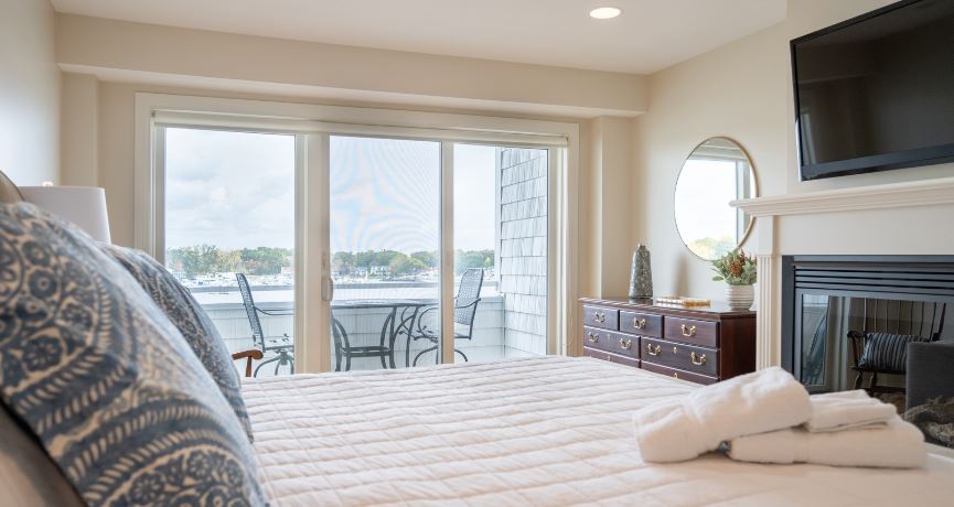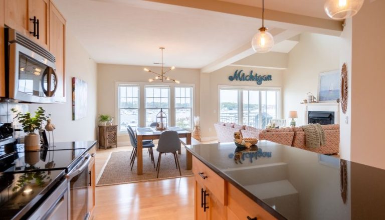 View Pointe: A two-story condo on the third floor of Lake Pointe Condos, offers elevator access and stunning Spring Lake and marina views. Designed for six guests, it features three stylish bedrooms and two full baths. The upstairs king suite has a gas fireplace, balcony, workspace, and spa-like bath. Two additional bedrooms and a bath with a walk-in shower are downstairs. The main level boasts a chef’s kitchen, open dining, a spacious family room with soaring ceilings and a fireplace, a full laundry room, and a balcony overlooking the lake, creating a perfect retreat with modern comforts.